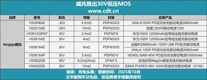 充电头网通过拆解了解到,威兆这款30V低压NMOS被迪奥科26800mAh 100W USB PD快充移动电源、iWALK 100W PD双向快充移动电源26800mAh两款产品采用。